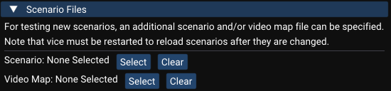 and selecting "Scenario Files". There, you can specify the locations of additional scenario and/or video map files to load when vice is launched.